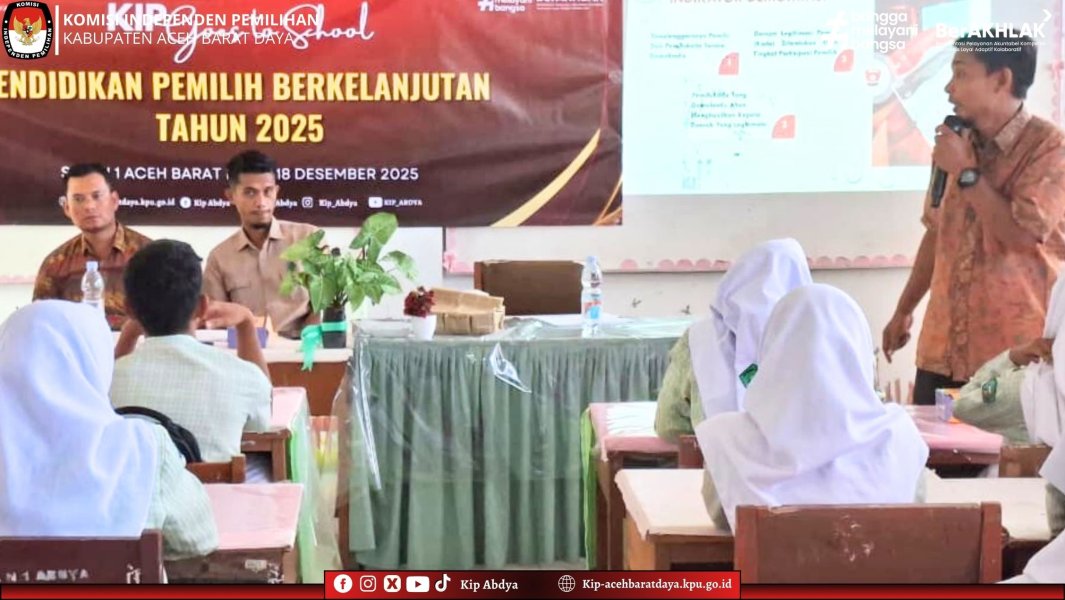 Blangpidie-Kip-acehbaratdaya.kpu.go.id Legitimasi Pemilu dan Pemilihan ditentukan oleh tingkat partisipasi pemilih. Hal tersebut disampaikan oleh Ketua KIP Abdya Iswandi dalam sambutan pada kegiatan Sosialisasi Pendidikan Pemilih Berkelanjutan tahun 2025 di SMA N 1 Aceh Barat Daya. Kamis, 18/12/25