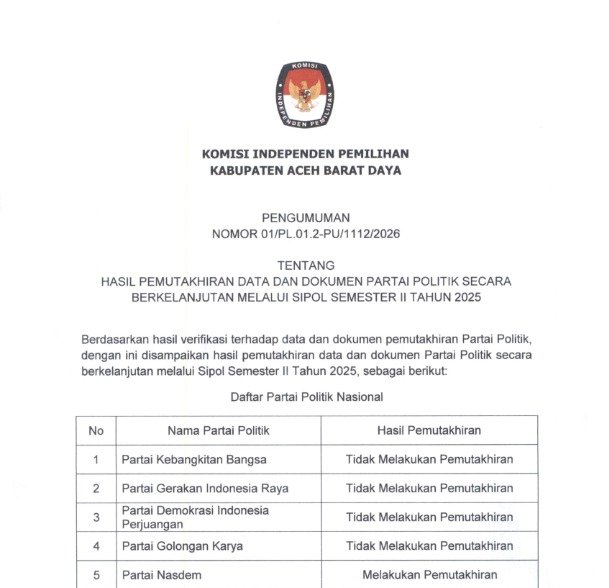 Pengumuman tentang hasil Pemutakhiran data dan Dokumen Partai Politik secara berkelanjutan melalui SIPOL Semester II tahun 2025.