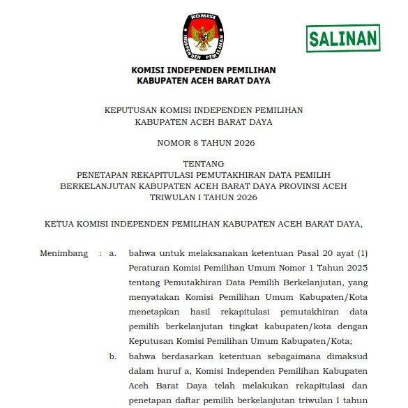 Keputusan KIP Aceh Barat Daya Nomor 8 Tahun 2026. Tentang Penetapan Pemutakhiran Data Pemilih Berkelanjutan Kabupaten Aceh Barat Daya Triwulan I tahun 2026.