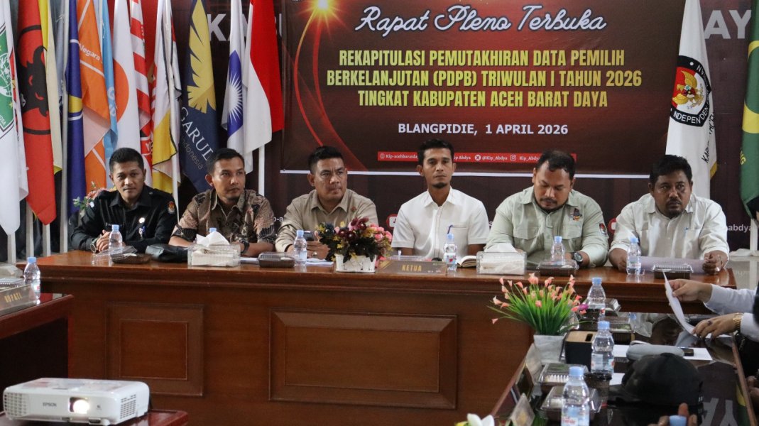 Blangpidie-Kip-acehbaratdaya.kpu.go.id Melalui Divisi Perencanaan Data dan Informasi KIP Kabupaten Aceh Barat Daya melaksanakan Rapat Pleno terbuka rekapitulasi Pemutakhiran Data Pemilih Berkelanjutan (PDPB) Triwulan I tahun 2026 tingkat Kabupaten Aceh Barat Daya. 1/4/26