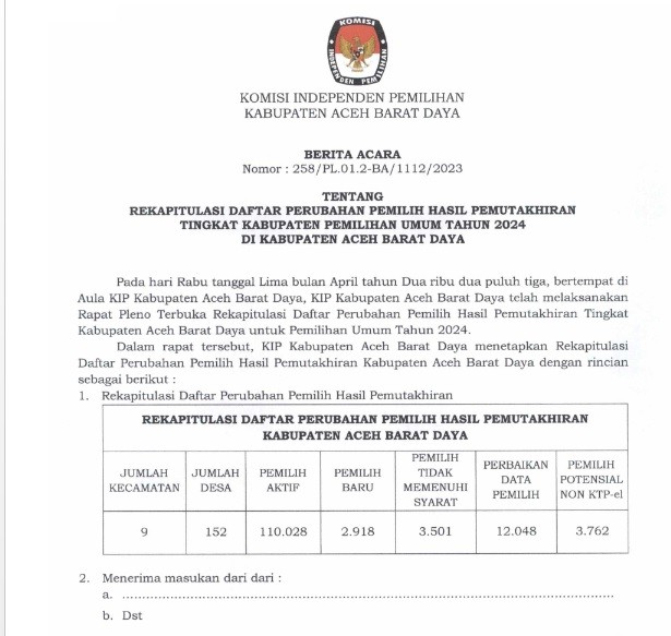 DAFTAR PEMILIH SEMENTARA (DPS) PENETAPAN REKAPITULASI DAFTAR PERUBAHAN PEMILIH HASIL PEMUTAKHIRAN TINGKAT KABUPATEN PEMILIHAN UMUM TAHUN 2024 DI KABUPATEN ACEH BARAT DAYA