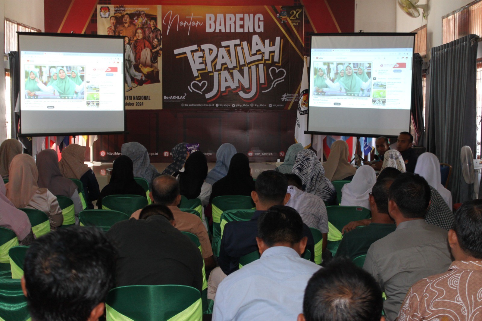 Kasubbag Hukum dan SDM KIP Abdya Mega Silfiani dalam sambutannya menyampaikan tujuan dilakukan Nobar 'Tepatilah Janji" adalah salah satu upaya untuk meningkatkan partisipasi pemilih dan pencerdasan ilmu politik yang tersaji didalam film "Tepatilah Janji"