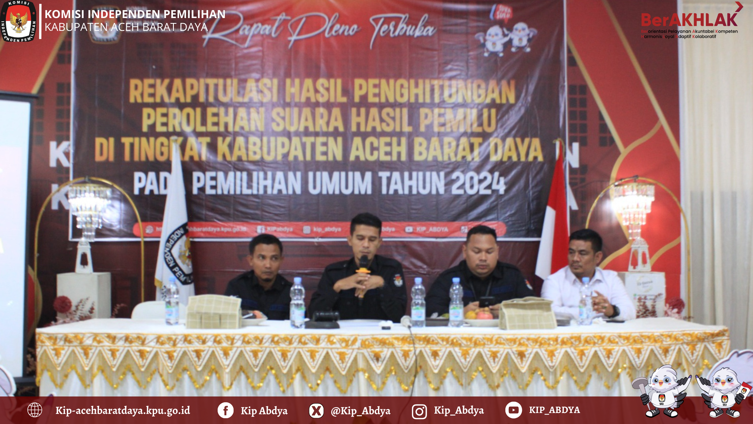 Rapat Pleno Terbuka Rekapitulasi Hasil Penghitungan perolehan Suara hasil Pemilu di tingkat Kabupaten Aceh Barat Daya pada Pemilu tahun 2024. Hadir pada acara tersebut Forkopimda Abdya, Panwaslih Abdya. Pimpinan Partai Politik, Para Saksi Peserta Pemilu, Pewarta dan pihak pengamanan.