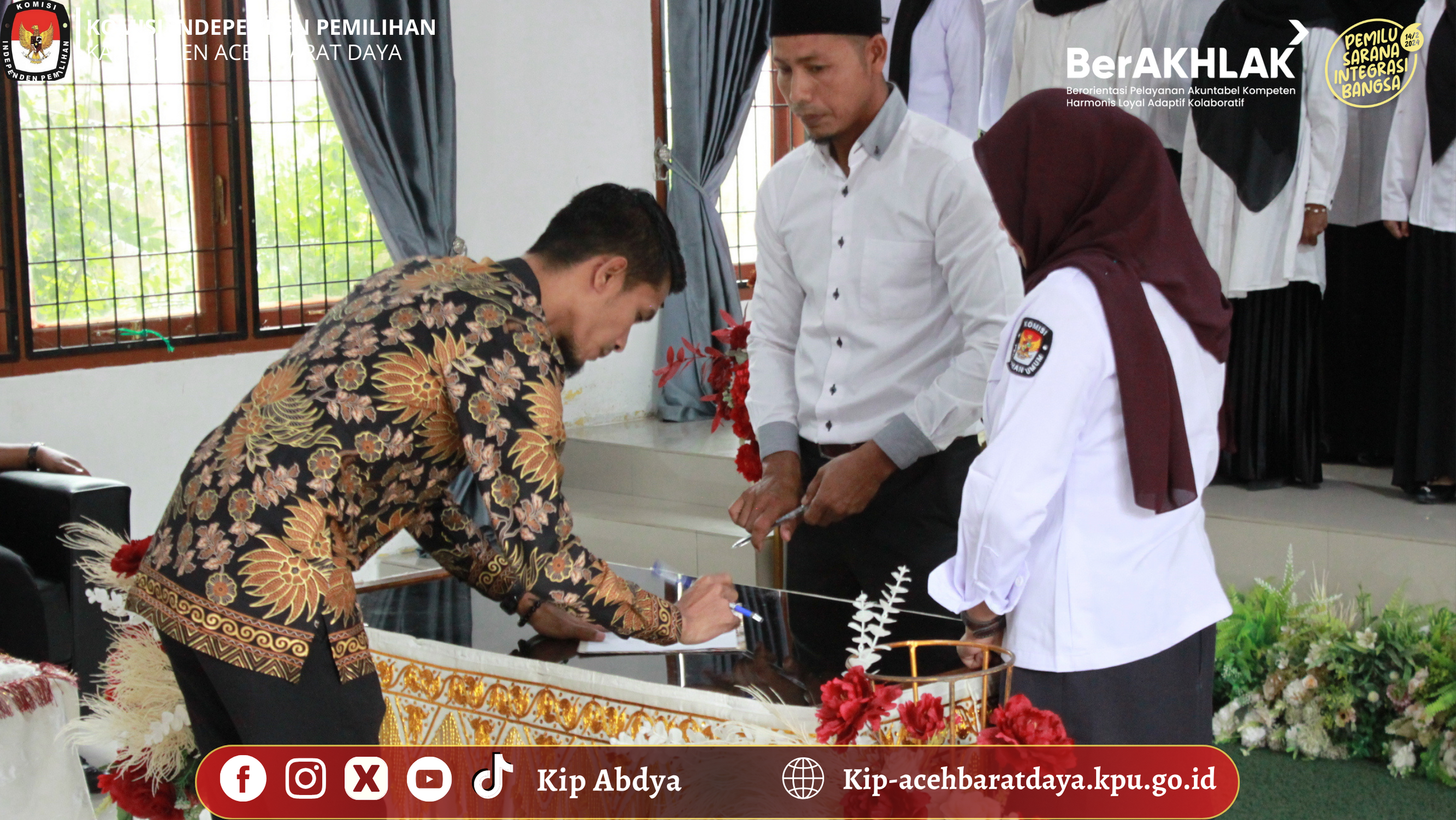 #temanpemilih Ketua KIP Abdya Iswandi, Anggota Deri Sudarma, Yudi Nirmansyah, Sayuti dan Masrizal melaksanakan pelantikan dan pengambilan sumpah Panitia Pemilihan Kecamatan (PPK) dalam pemilihan Gubernur dan Wakil Gubernur Aceh, serta Bupati dan Wakil Bupati Aceh Barat Daya tahun 2024. 16/5/24