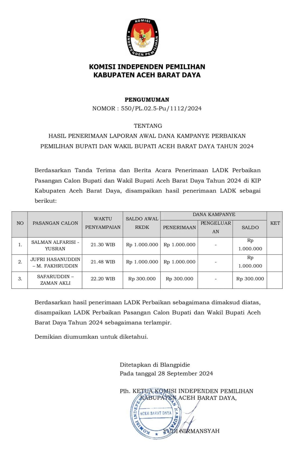 Hasil peneriaan Laporan Awal Dana Kampanye Perbaikan Pemilihan Bupati dan Wakil Bupati Kabupaten Aceh Barat Daya tahun 2024