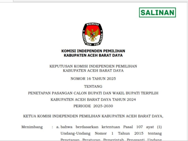 Keputusan Komisi Independen Pemilihan Kabupaten Aceh Barat Daya Nomor 16 Tahun 2025. Tentang Penetapan Pasangan Calon Bupati dan Wakil Bupati Terpilih Kabupaten Aceh Barat Daya Tahun 2024 Periode 2025-2030.