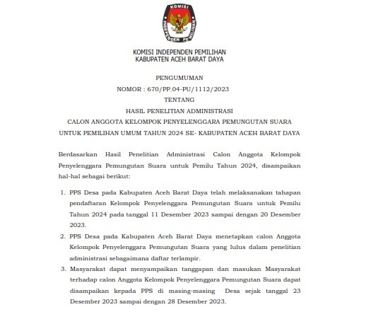 Pengumuman Hasil penelitian Administrasi Calon Anggota Kelompok Penyelenggara Pemungutan Suara (KPPS) untuk Pemilihan Umum Tahun 2024 Se-Kabupaten Aceh Barat Daya.