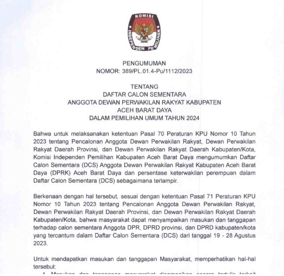 PENGUMUMAN DAFTAR CALON SEMENTARA ANGGOTA DPRK ACEH BARAT DAYA DALAM PEMILU TAHUN 2024