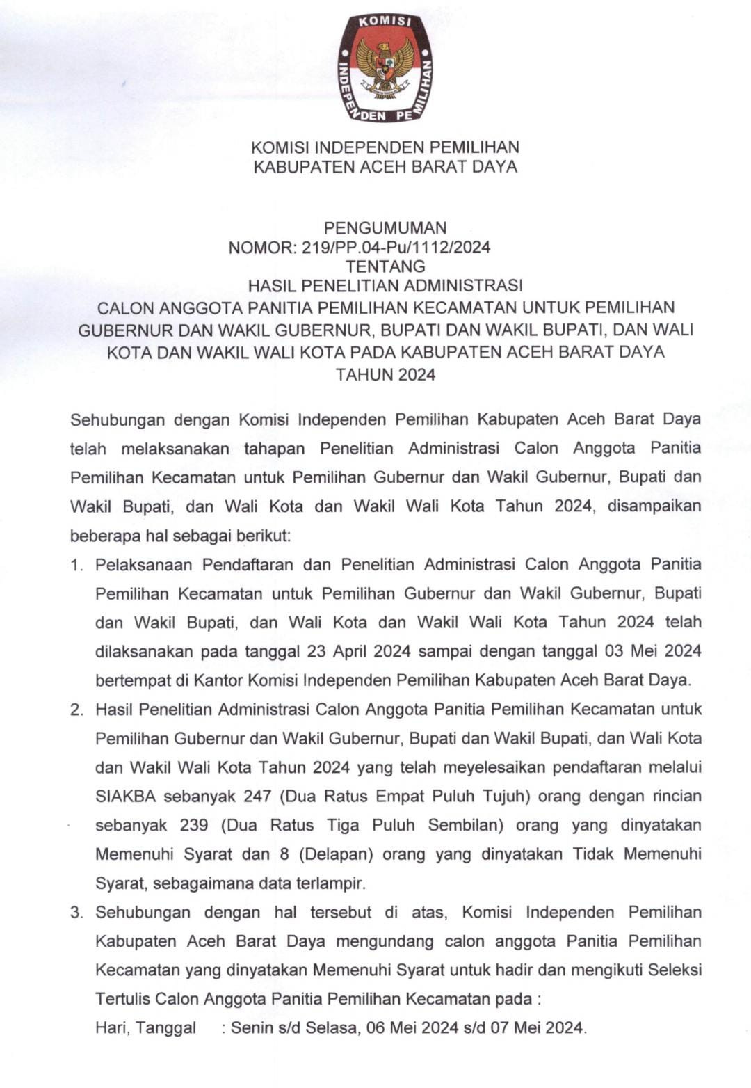 Pengumuman Nomor 219/PP.04-Pu/1112/2024 Hasil Penelitian Administrasi Calon Anggota Panitia Pemilihan Kecamatan (PPK) untuk pemilihan Gubernur Dan Wakil Gubernur Aceh serta Bupati Dan Wakil Bupati Aceh Barat Daya Tahun 2024