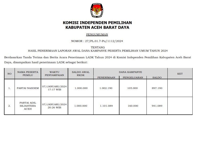 PENGUMUMAN HASIL PENERIMAAN LAPORAN AWAL DANA KAMPANYE PESERTA PEMILU TAHUN 2024 KABUPATEN ACEH BARAT DAYA