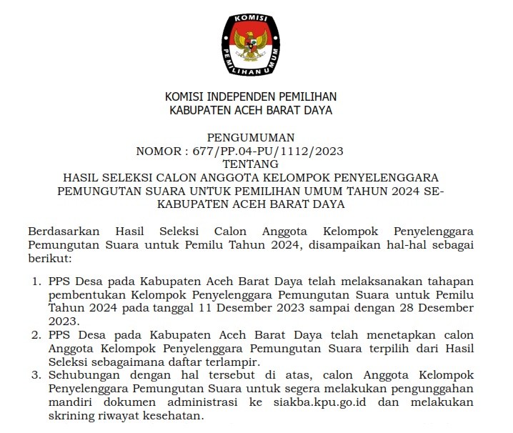Pengumuman tentang hasil seleksi calon anggota KPPS untuk pemilihan umum tahun 2024 Se-Kabupaten Aceh Barat Daya.