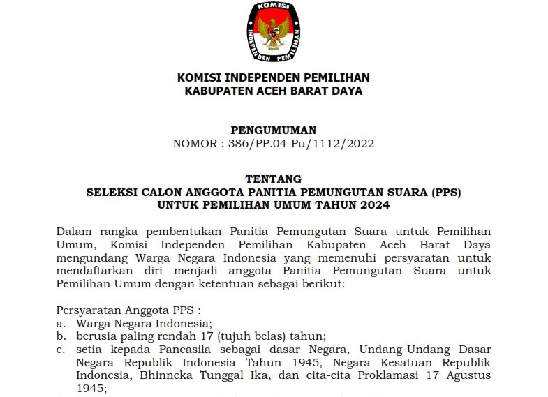 PENGUMUMAN HASIL SELEKSI CALON PPS KIP ACEH BARAT DAYA UNTUK PEMILU TAHUN 2024