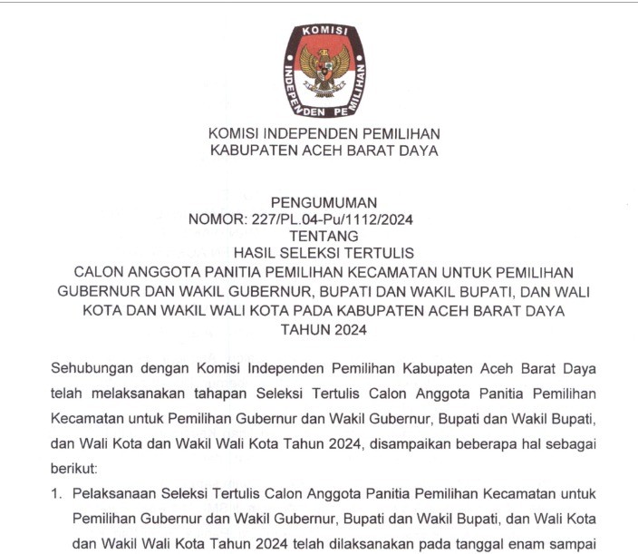 PENGUMUMAN HASIL SELEKSI TERTULIS CALON ANGGOTA PPK DALAM PILKADA TAHUN 2024 KIP ACEH BARAT DAYA