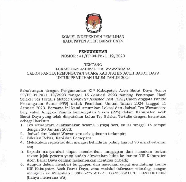 Lokasi dan Jadwal tes Wawancara calon Panitia Pemungutan Suara (PPS) KIP Kabupaten Aceh Barat Daya untuk Pemilihan Umum Tahun 2024.