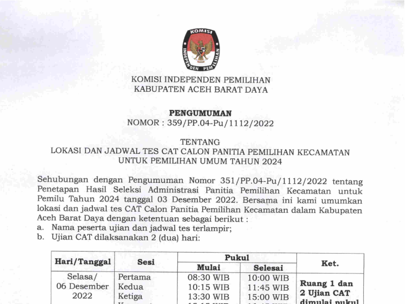 Lokasi dan jadwal tes CAT Calon Panitia Pemilihan Kecamatan untuk Pemilihan Umum tahun 2024.