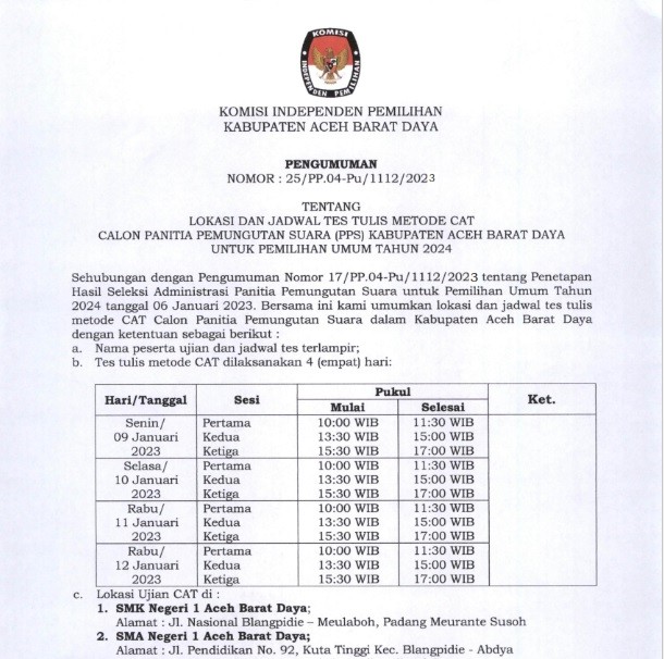 Pengumuman Lokasi dan jadwal tes Ujian tulis metode CAT bagi Calon Panitia Pemungutas Suara (PPS untuk pemilu tahun 2024 KIP Kabupaten Aceh Barat Daya.