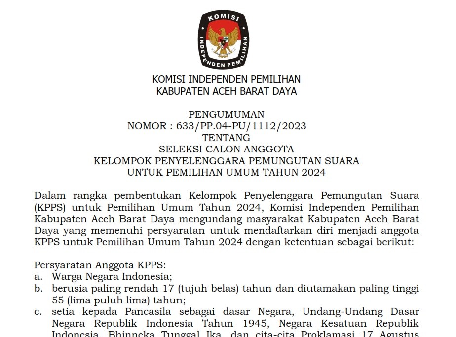 Dalam rangka Pembentukan Kelompok Penyelenggara Pemungutan Suara (KPPS) untuk Pemilihan Umum Tahun 2024. KIP Aceh Barat Daya mengundang masyarakat Kabupaten Aceh Barat Daya yang memenuhi persyaratan untuk mendaftarkan diri menjadi Anggota KPPS untuk Pemilihan Umum tahun 2024.