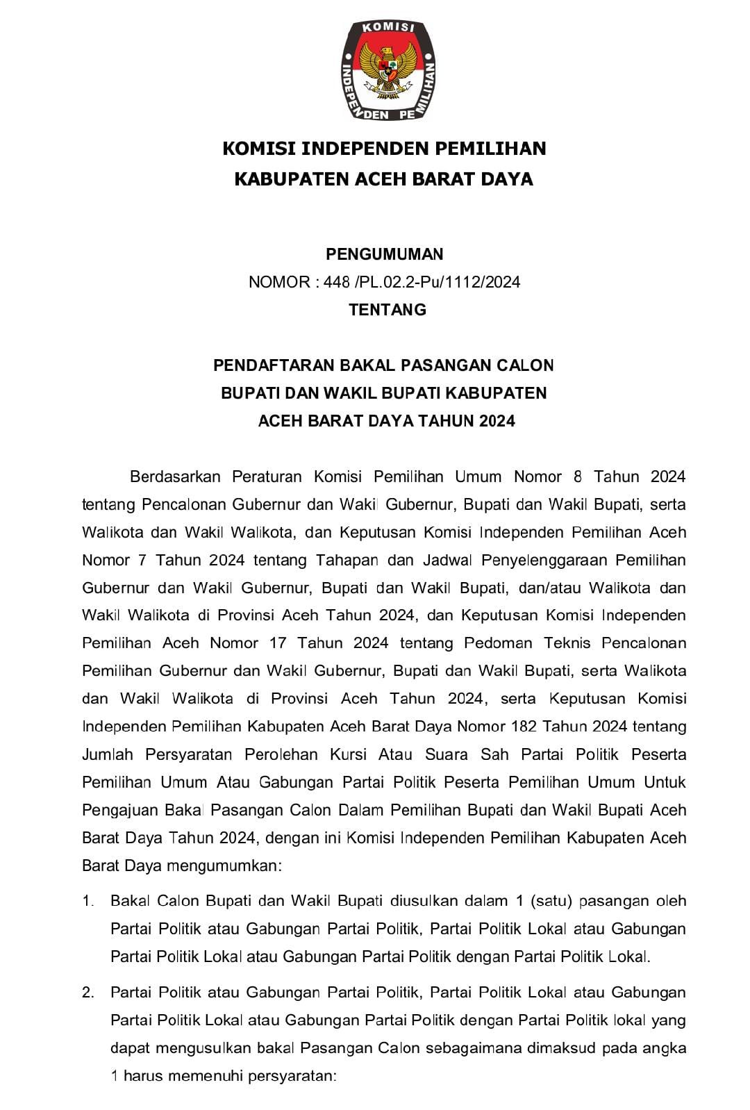 PENGUMUMAN PENDAFTARAN CALON BUPATI DAN WAKIL BUPATI ACEH BARAT DAYA TAHUN 2024