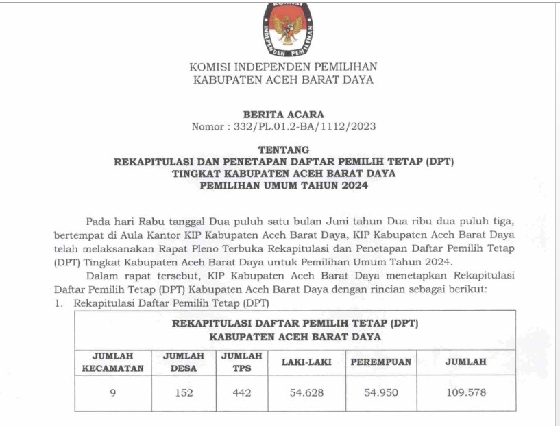 PENGUMUMAN REKAPITULASI DAN PENETAPAN DAFTAR PEMILIH TETAP (DPT) TINGKAT KABUPATEN ACEH BARAT DAYA PEMILU TAHUN 2024
