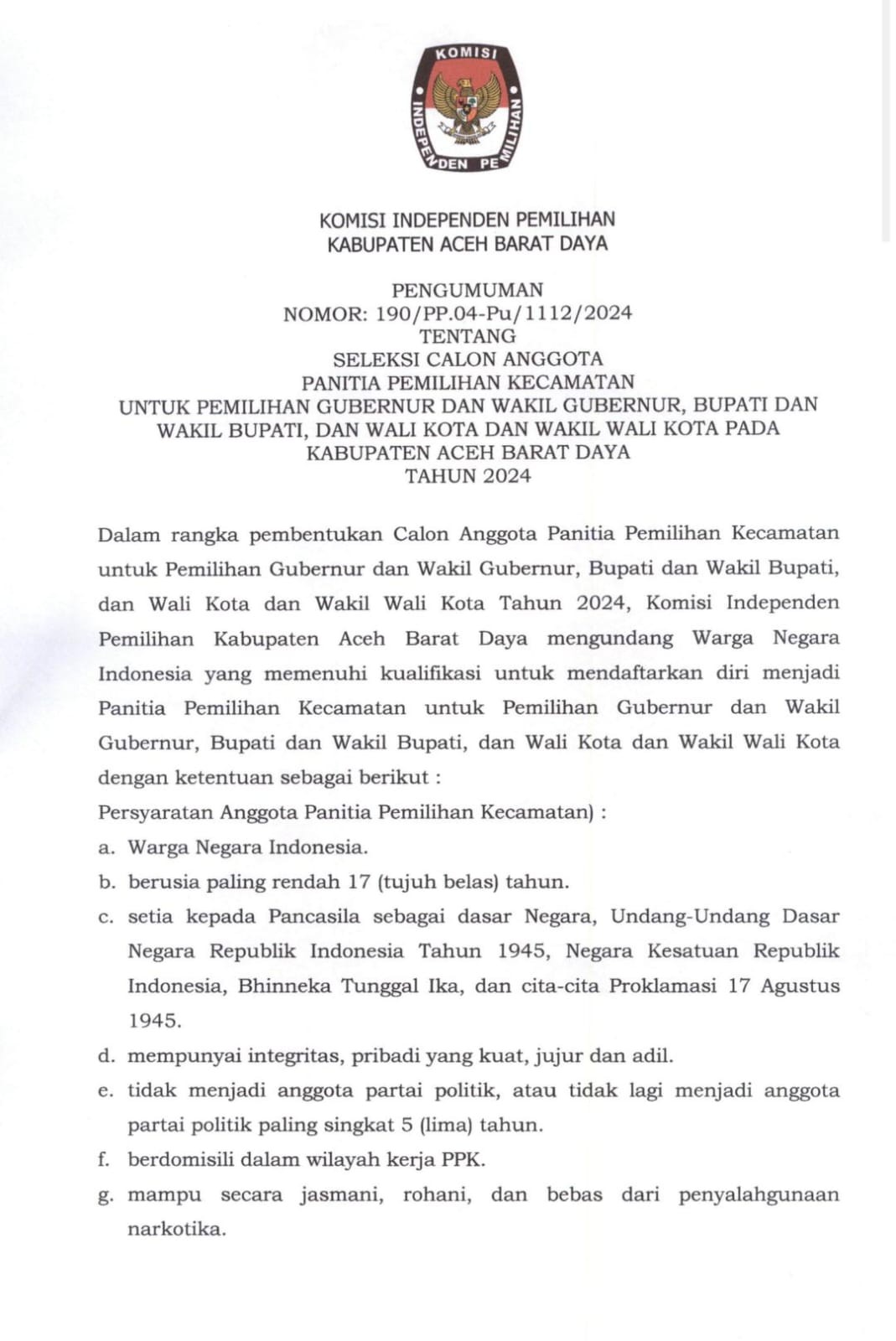 Pengumuman Nomor 190/PP-04Pu/1112/2024 Tentang Seleksi calon anggota Panitia Pemilihan Kecamatan untuk pemilihan Gubernur dan wakil Gubernur Aceh serta Bupati dan Wakil Bupati Aceh Barat Daya Tahun 2024.