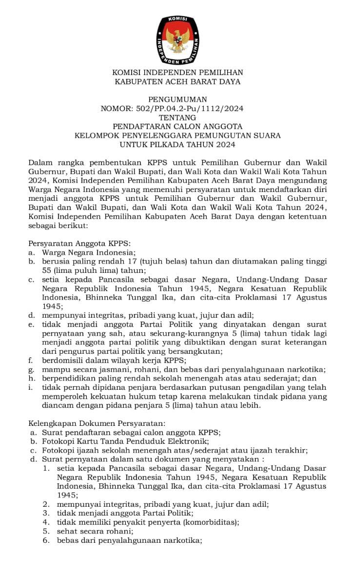 Pengumuman nomor 502/PP.04.2-Pu-1112/2024 Tentang Pendaftaran Calon Anggota Kelompok Penyelenggara Pemungutan Suara untuk Pilkada Tahun 2024.