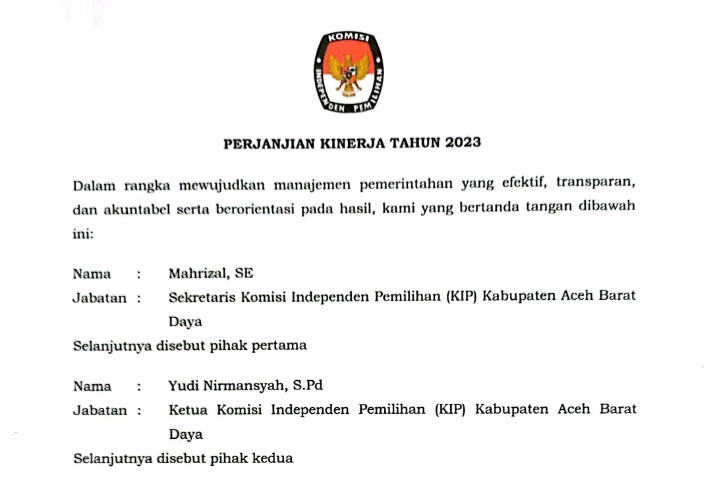 Perjanjian Kinerja Sekretaris KIP Kabupaten Aceh Barat Daya Tahun 2023